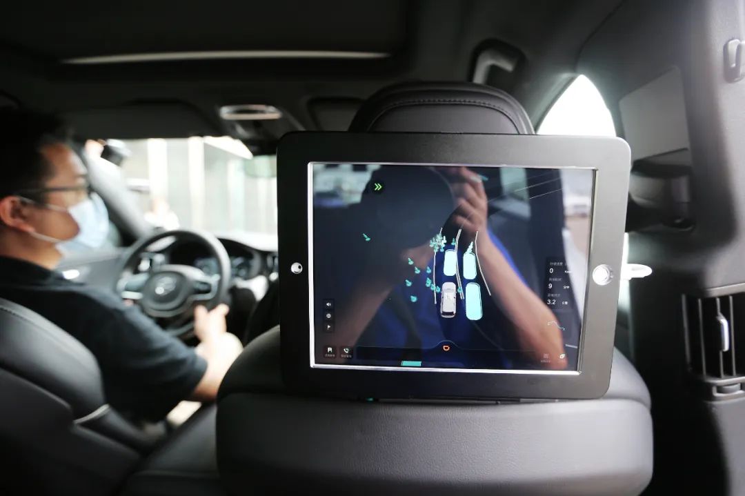 “现在我们前方的信号灯被这辆大货车遮挡了,但是车辆接收到了信号灯变为绿灯的信息,就会缓慢地自动启动。”“刚才雷达检测到前方斑马线有电瓶车,车辆会计算电瓶车通过的时间,并提前减速,确保通行安全。”乘客座位前方的两块电子屏,会实时显示道路路况、信号灯情况等。每次车辆采取相应措施后,安全员也都同步予以讲解。