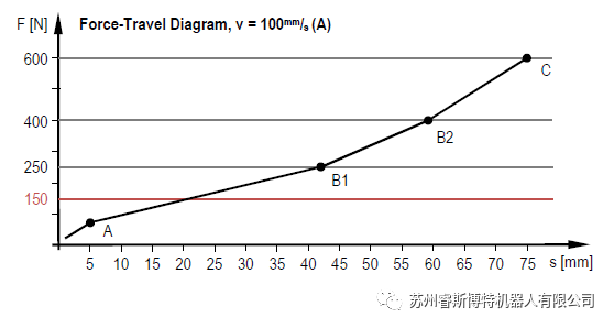由于叉车AGV自重较重,并且有刹车较长,按照CE和CR中安全要求,我们在设计过程中,需要关注250N和400N两个碰撞压力下的行程,以瑞士保策EPE040-105A0J为例。