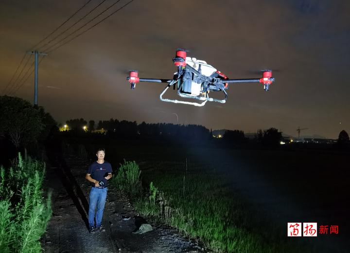 “这是给单季稻除草,因为白天气温高,无人机喷施的药水容易蒸发,影响治虫效果,所以选择夜间进行。”赵海港解释说。