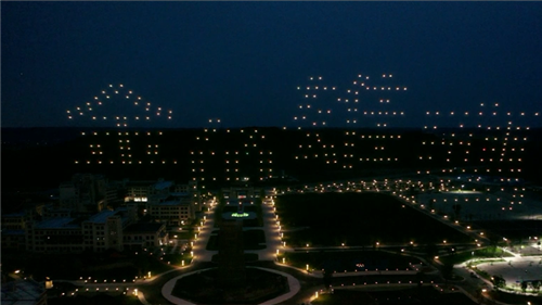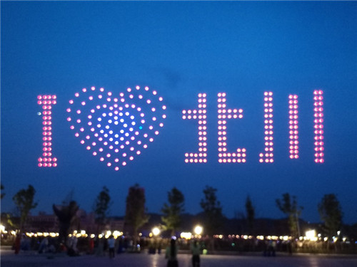 夜幕降临以后,伴随着欢快热烈的节奏,300架无人机整齐地做出自旋翻、自旋漏斗等高难度飞行动作,仿佛在夜空中翩翩起舞。此外,无人机在夜空中呈现出的极具羌族特色的绵阳飞行职业学院建筑图案,以及“我爱北川”、“金色雄鹰”、“绵阳飞行学院”等字样,使人叹为观止。