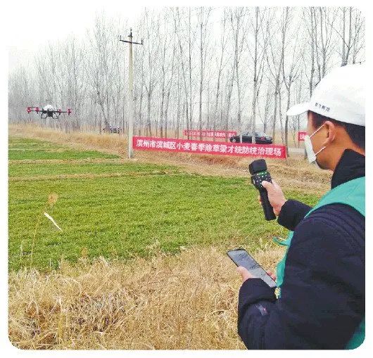 图:今年春季,滨州市滨城区供销社三河湖为农服务中心张露露操控无人机进行飞防作业。(□赵琳 报道)