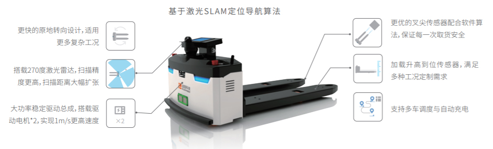 近年来,随着叉车AGV的市场使用率逐步提高,迦智科技针对行业应用的痛点,推出了这款轻量级激光SLAM地面式自动叉车,适用于各种工业场景,部署方便,路线灵活,在窄通道里也能自由穿梭。