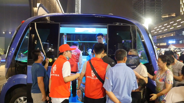 夜幕降临,3台苏州金龙L4级无人驾驶巴士深蓝在五彩斑斓的霓虹灯映照下穿梭运行,极具辨识度的外观“吸睛十足”,引得市民们争相排队体验。主办方介绍,他们在活动区域内特意划出1.5公里道路,让市民“零距离”体验无人驾驶乐趣。自动起步、加速、转弯、避让障碍物……在纯白色的乘坐区内,乘客们看着深蓝在没有人工干预的情况下自动完成了所有操作,并在苏州金龙工程师的讲解下了解了“智能巴士”是如何拐弯转向、如何避开行人的。乘着深蓝,看着沿街风景,家住环秀湖花园的小朱忍不住点赞,“第一次乘坐无人驾驶巴士,很新鲜!感觉未来真的离我们很近,希望相城以后多多举办类似的活动!”