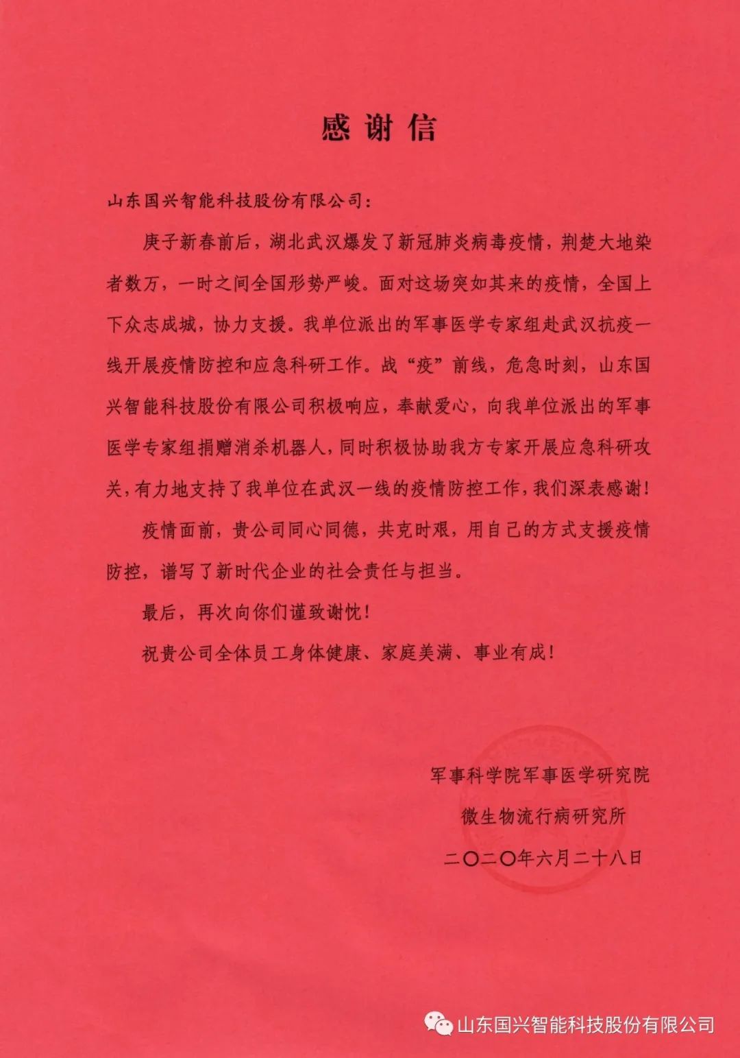 近日,我司收到来自军事科学院军事医学研究院微生物流行病研究所的感谢信。这是对国兴智能疫情期间积极响应、奉献爱心的肯定。