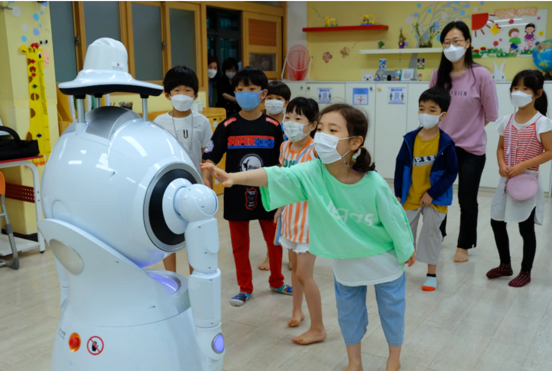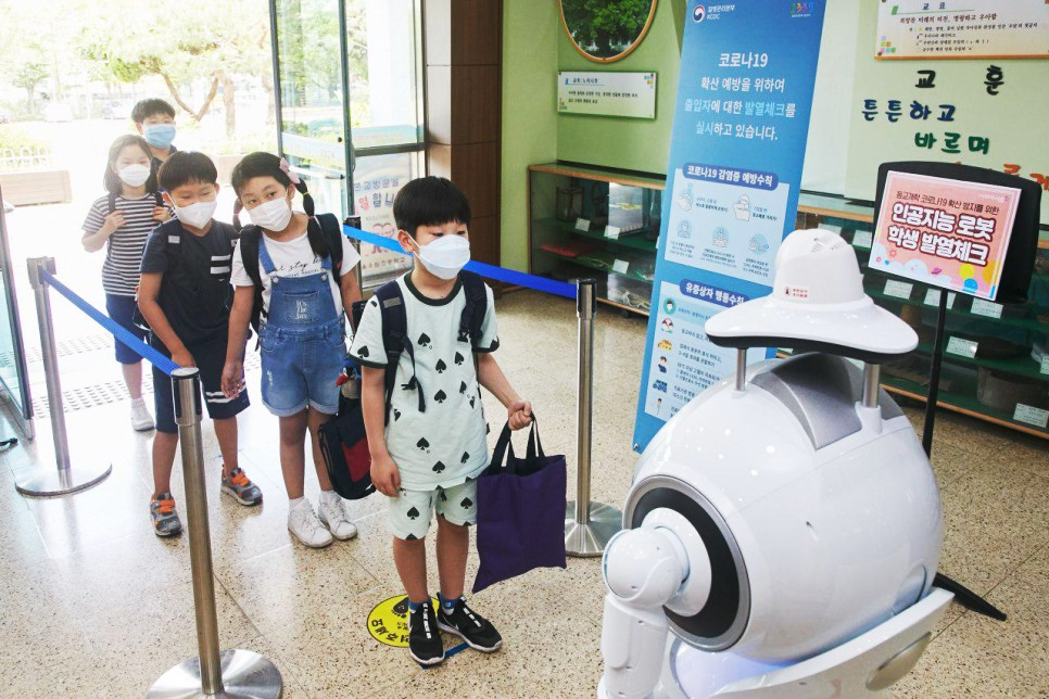 早在6月初,瑞草区政府在一楼大厅部署咨询测温机器人Cruzr(克鲁泽),辅助安保人员进行多人同时测温、口罩佩戴提醒、疫情宣传播报等,大量缓解了高峰时段排队测温情况,排除了人流密集可能造成交叉感染的安全隐患。瑞草区厅长赵恩熙表示:“全球疫情爆发无接触社会到来,AI防疫机器人的引进符合趋势,我们采用最先进的技术预防校园交叉感染,给学生提供一个安全的学习环境。”