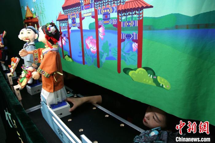 图为,济南木偶戏传承人李秀平操纵“木偶机器人”,进行木偶戏表演。李秀平将中国传统木偶与智能化技术结合,创造“木偶机器人”,配套搭建便携式舞台。 孙宏瑗 摄
