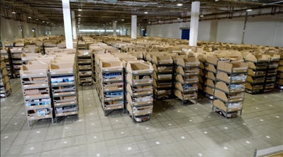 正在京东智能物流园库房内作业的智能机器人。