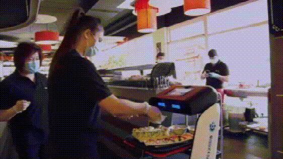在这家日式餐厅,后厨人员完成菜品制作,而后放置在Butter的四层大托盘上,在屏幕上按下餐桌号后,它就会在短时间内完成餐食从厨房到目的地的配送。顾客只需在机器人语音提示取餐时,自己端走餐盘,然后点击屏幕确认,机器人就会原路返回。