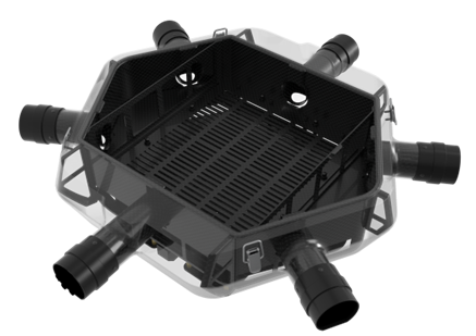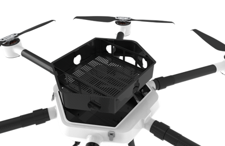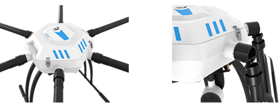 六边形中心盘呈现宝石外形,外观新颖,形象刚硬,符合工业级无人机的硬派风格。和传统的圆盘形外观相比,六边形中心盘体积更小,内部空间布局更合理,电子元器件间走线更短。通过最大化利用机内容积,电池仓可以容纳两块26000mAh高压版锂聚合物电池,为工业级无人机的长续航设计打下了良好的结构基础。