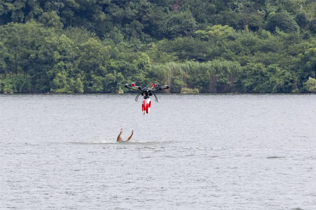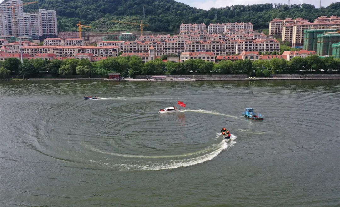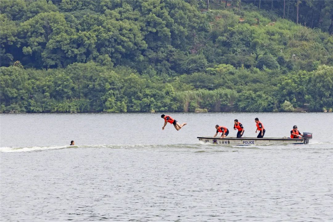 演练科目模拟一游船发生故障,两名游客落水。特警队员迅速出动无人机锁定落水人员位置,并投放救生圈。水上救援小组驾驶冲锋舟至群众落水处,对落水者进行救援,救援快艇对故障船只上被困的群众进行转移。