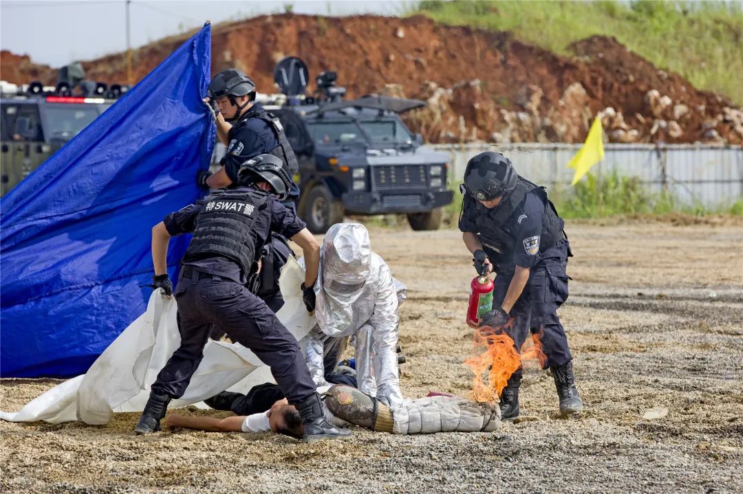演练模拟一伙“暴恐分子”携带砍刀、自制爆炸装置潜入市区,随时准备发动恐怖袭击,特警支队街面巡逻组接到指挥中心调警后,第一时间赶往现场制服2人,其余3人抢夺一辆私家车逃窜,躲入一栋废旧大楼。