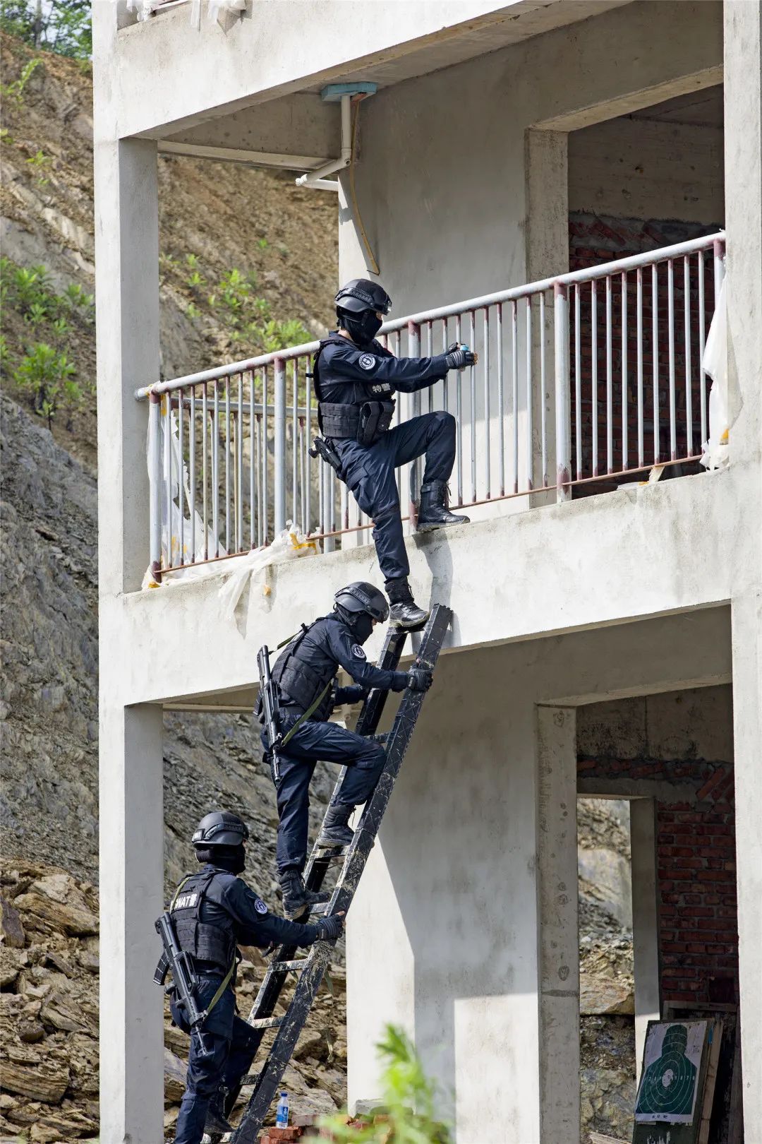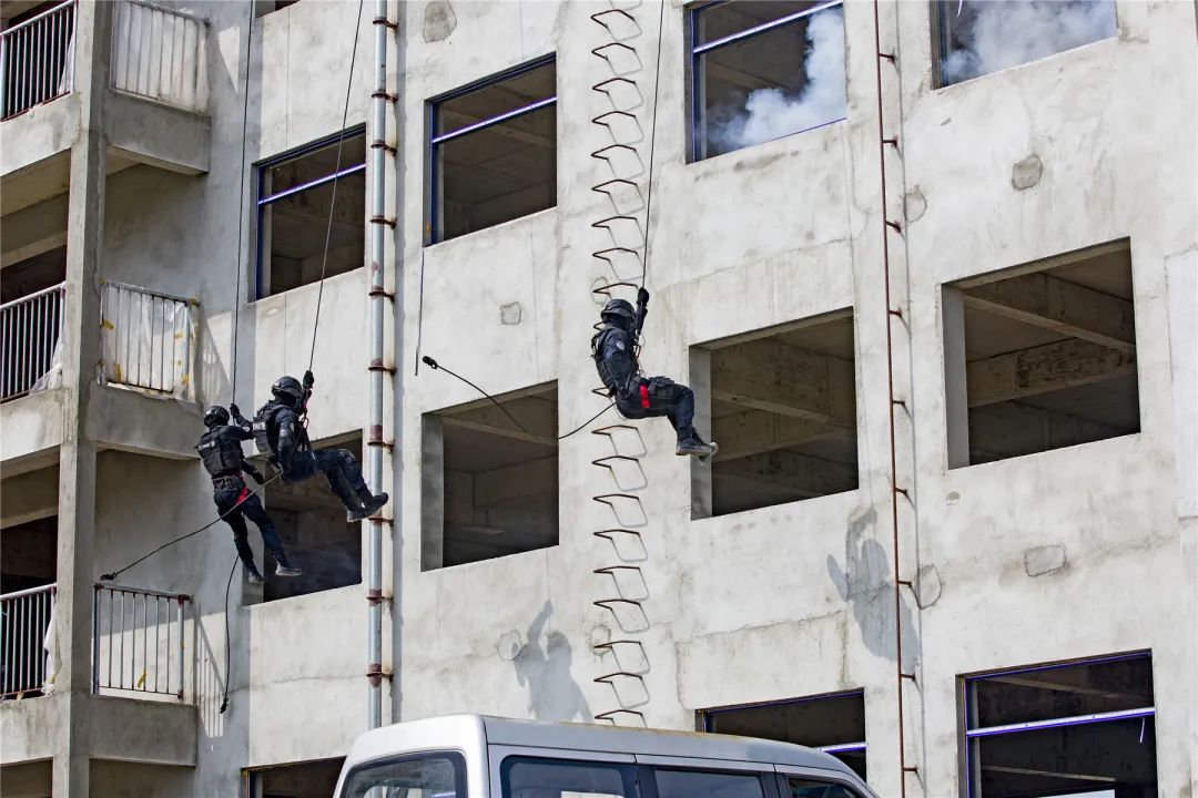 特警突击队员对现场情况进行侦查后,分三组同时突进:突击一组利用攀登梯从二楼阳台突入,突击二组从正门突入,索降组倒滑至二楼投掷震爆弹后迅速突入,队员们协同作战,快速反应,将“暴恐分子”一网打尽。