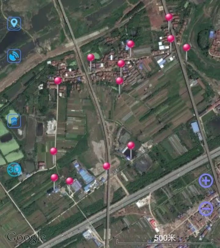不同类型的区域放控制点的方法不同,这里简单介绍一下布放控制点的方法。这里我以自己熟悉的地形为例,小面积的农村地,建议控制点分布均匀,根据测区精度要求决定控制点密度,1:2000,基本上一个普通大小村子(0.1km2)就放四五个控制点,如图所示。