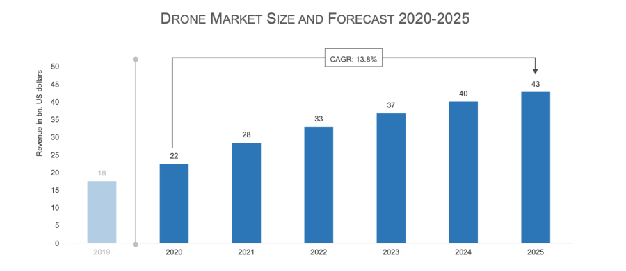 根据德国无人机研究公司Drone Industry Insights的报告得出指出,预计到2025年,全球无人机市场规模将达到428亿美元。数据基于6月底发布的《 2020-2025年无人机市场报告》。
