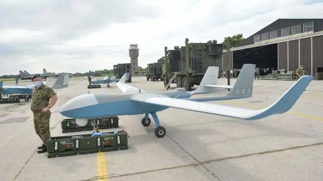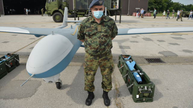 塞尔维亚军队接收的CH-92A无人机,背景是米格-29战斗机