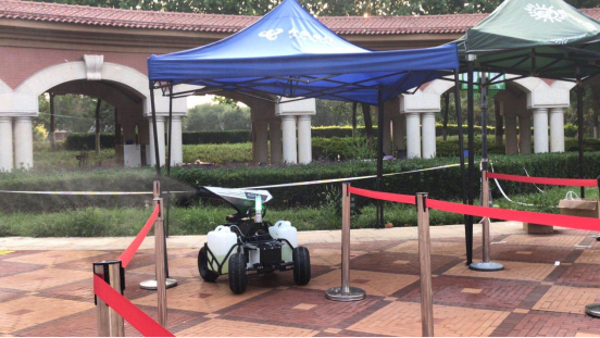 据介绍,北京蓝天救援队使用的消毒机器人是松灵机器人(东莞)有限公司特别为本次高考防疫捐赠的。该消毒机器人专为室内外大规模消毒作业防疫研制,具有噪音小、无需燃料、喷洒流量可调、可远程控制等特点,适合各种强氧化消毒液,其喷雾颗粒<150微米,雾滴的有效沉积可对病毒进行包裹灭活,从而有效阻断病毒的进一步传播。