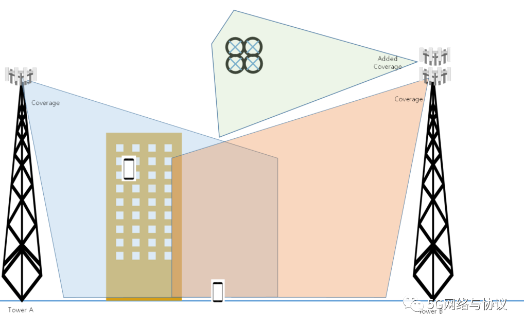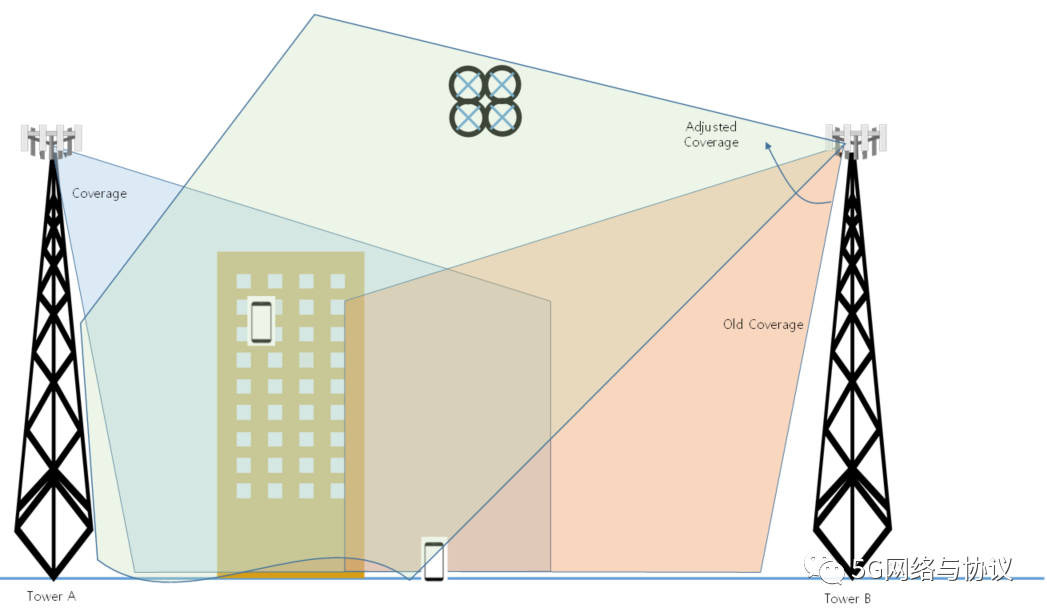 随着无人机通信业务的引入,一些UE位于常规覆盖范围之上。因此,需要调整天线系统,比如俯仰角等,以便在无人机运行的高度有一个覆盖范围: