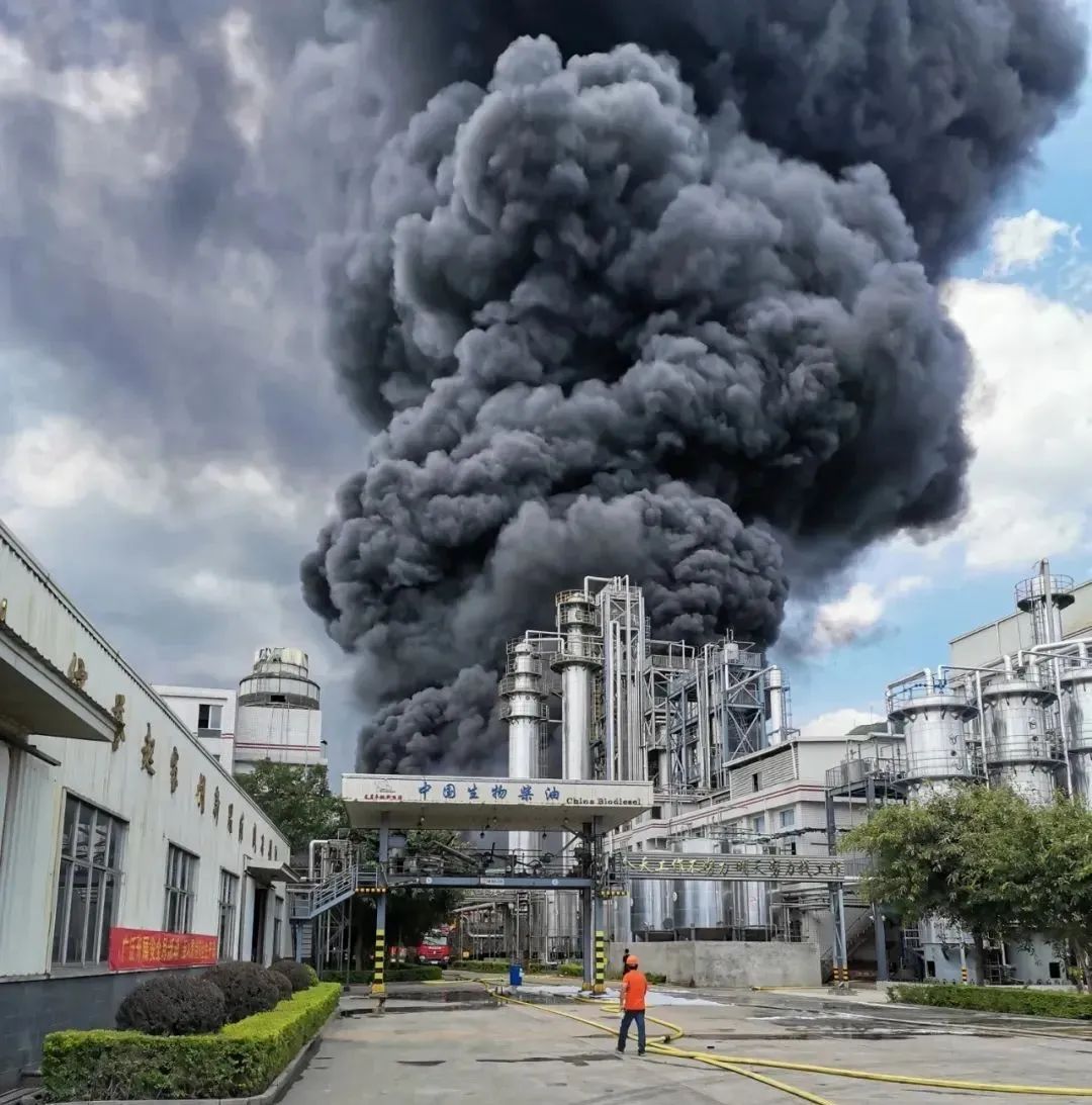 着火区域为罐区,约150立方米罐体3个,周边堆积多个大小罐体,主要储存植物油、生物柴油、甲醇等物质。现场易燃物多,浓烟较大,给扑救带来极大困难。