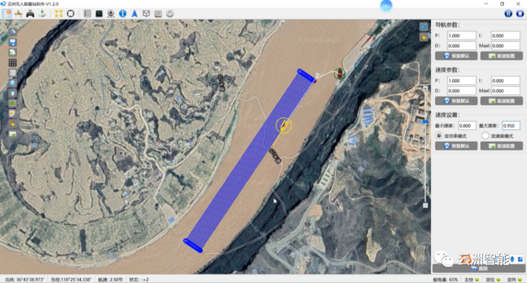 通过软件设置测线、无人船根据任务测线自主航行测量