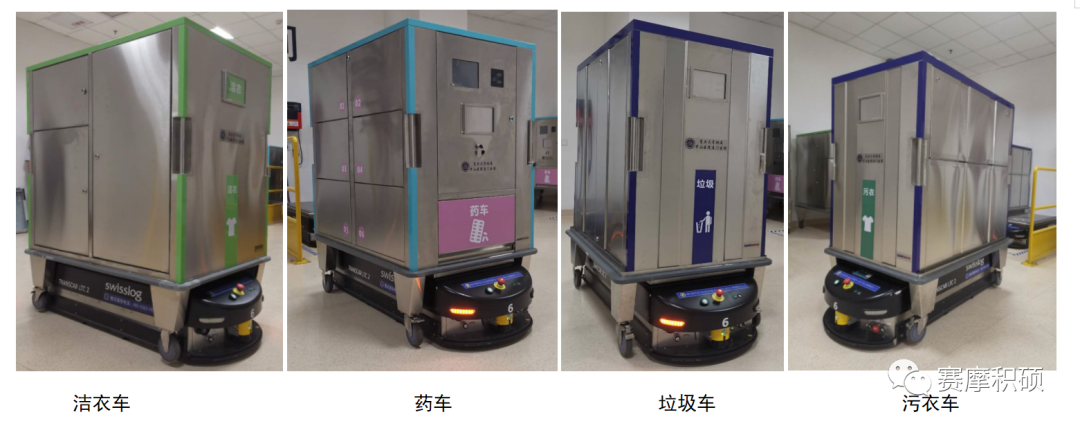 复旦中山厦门医院AGV系统覆盖三栋院内建筑,为800床位的医院提供重型物流;涉及厨房、静配中心、药房、病区以及污物中心等5个重点科室。积硕科技根据医院输送物品需求,研发出垃圾车、污衣车、洁衣车、智能药车。垃圾车、污衣车、洁衣车为普通推车,实现物品运送。智能药车具有闭环管理,实现背对背交接功能,能够对取药人和存药人及时间进行记录,同时通过分配不同的存储位置可以将病区关联,可以实现一车为多个病区配送且只有对应病区的人才能取出对应病区的药品。