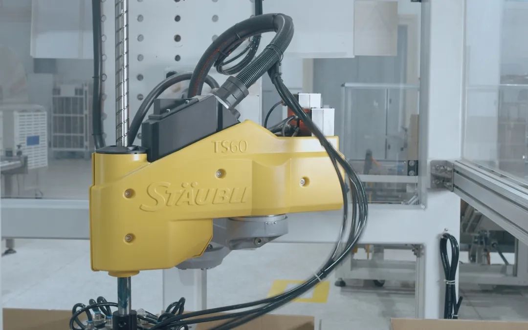 设备集成商提出一种基于史陶比尔TS60 SCARA四轴机器人的解决方案。TS60机器人具有很高的工作速度,并具有更广的工作范围和灵活性,机器人手臂可以靠墙安装在工作区域的一侧,空间利用率高。