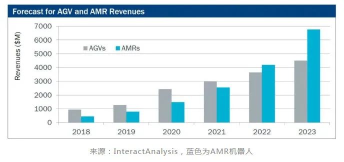 在仓储环节的各类智能设备中,AMR发展速度最快。艾瑞认可AMR的快速商业化,但对AMR市场规模增速的预测仍显保守。来自Interact Analysis数据,2023年全球AMR市场就将爆发至70亿美元。