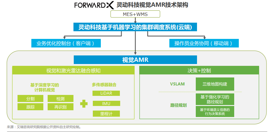 以灵动科技V-AMR(视觉自主移动机器人)为例。灵动借助雷达、摄像头等多传感器融合的解决方案,不仅极大降低了激光雷达过高成本,还以其自主开发的机器人边缘计算操作系统和云端多智能体集群调度系统确立了核心优势和技术壁垒:前者通过多传感器融合、基于深度学习的计算机视觉、强化学习、VSLAM等技术赋予机器人本体环境感知、地图构建、自主避障、自主规划路径的能力;后者则以具备任务管理、实时监控等功能的智能调度系统确保同一环境下的多个AMR协同工作,并实现人、机、系统的有效协调,帮客户实现人效提升2倍以上、拣货成本下降超过30%。