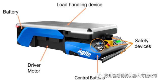 一般来说,AGV 主要由安全装置(急停按纽,激光雷达,安全PLC,安全速度模块),控制装置,负载搬运装置,驱动装置,电池和电机等组成。其中,控制方面,包括功能控制(如指令解析,无线通信,导航数据处理,图像处理等),动力控制(如电源,充电控制等),安全控制(如障碍物检测,速度和转向控制等)。