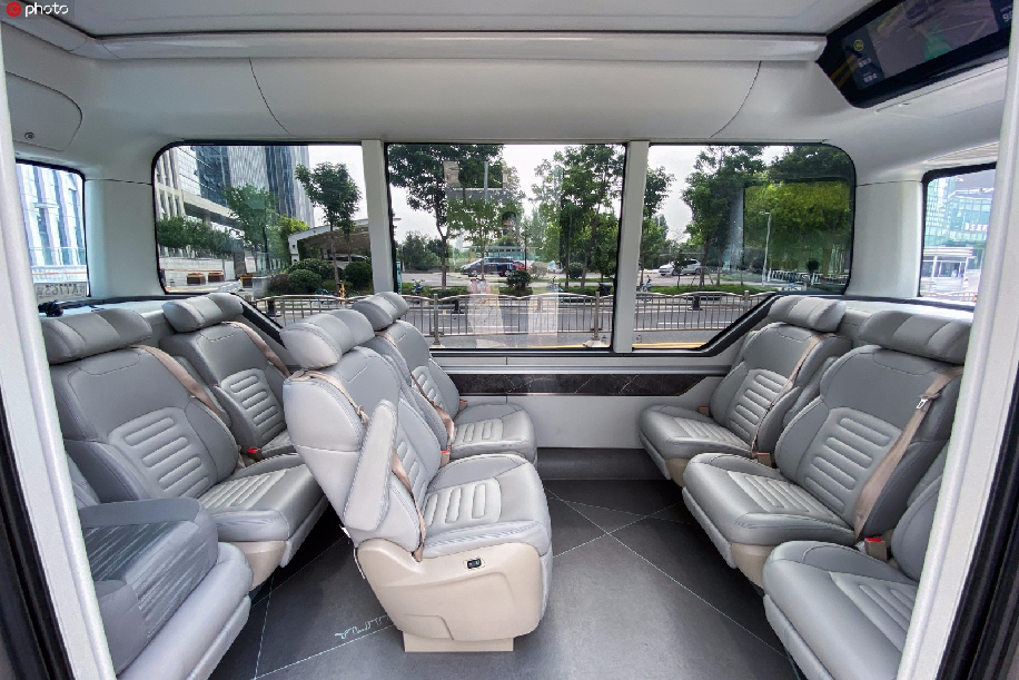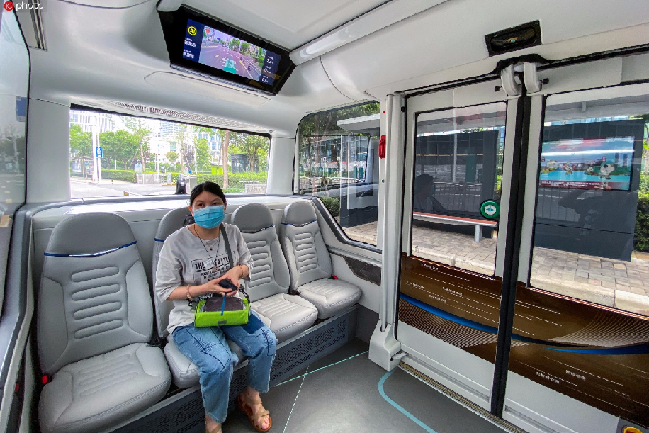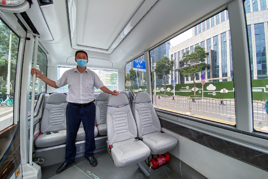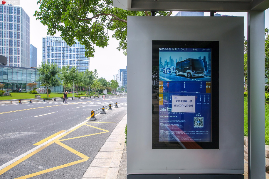 2020年7月23日,河南省郑州市,郑东新区龙子湖智慧岛的5G无人驾驶公交车试运行已超一年。运行以来,这条公交线路已安全行驶超3万公里,免费搭乘体验的市民超2万人次。(来源:东方IC)