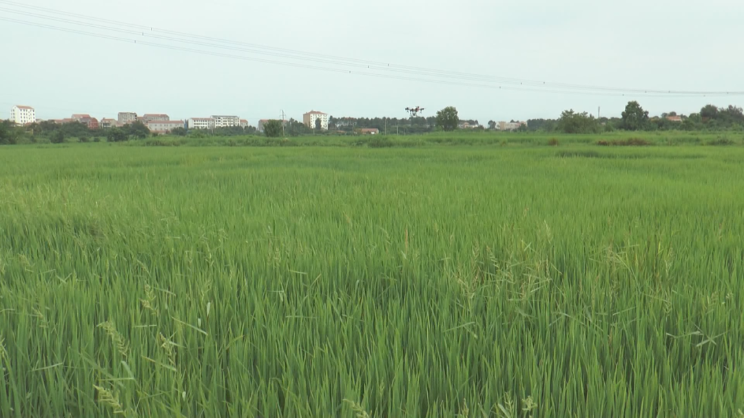 在陡山乡种粮大户刘雷的田埂上方,一架四翼无人机正在来回作业,随着无人机的飞行轨道,一道道药物从天而降,均匀地洒在田里,不一会的功夫,几十亩水稻田就完成了打药,既省时又省力。