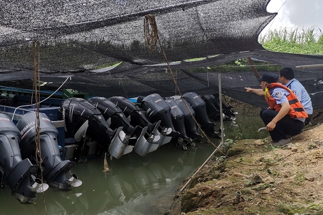 7月1日,南沙缉私分局缉私警察根据线索研判南沙区西樵水道附近水域可能藏匿“三无”走私快艇,据此迅速联合广州市公安局南沙区分局,出动警车及缉私艇开展大规模联合搜查。由于藏匿地点异常隐蔽,联合行动组初步搜索无果,随即启用无人机再度搜索藏匿地点,从高空俯瞰发现位于西樵水道的一处无人岛上有用黑色、迷彩色纱网布掩盖的大型遮蔽物。联合行动组马上组织人员包围无人岛,海关缉私艇在水道外围警戒,地方公安无人机在上空侦查。在安排人员岸边警戒的同时,联合行动组登上无人岛,侦查发现此岛“内有乾坤”。岛内有一个池塘,池塘与外界连接的水道狭窄而隐蔽,还以纱网布遮挡,需要使用锋利的刀具割开后小艇才能勉强进入。海关缉私警察清除入口障碍后,借用民用快艇通过入口水道进入池塘,发现内部还有一个用铁闸门隔离的小水塘,打开铁闸门后发现藏有5艘大马力快艇。现场查获的大马力快艇大部分安装了3台250~350匹马力的大马力马达,其中一艘快艇更是装有4台马达,马力高达1200匹,最高航速可达70节(约130公里每小时)。