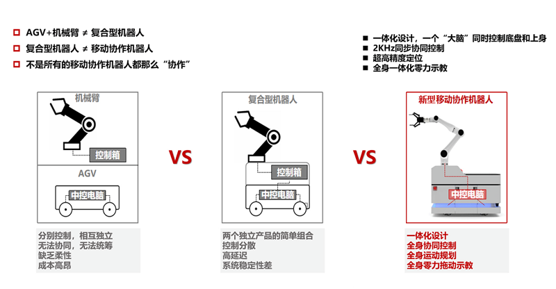 但是对于集成商或者终端企业而言,更希望找到一家能提供机械臂、AGV、视觉等一站式采购服务的供应商,所以就有了复合型机器人的“升级版”——移动AGV协作机器人。这种机器人不需要集成商再去二次开发,直接用一个控制器解决所有部件,多快好省,一步到位。