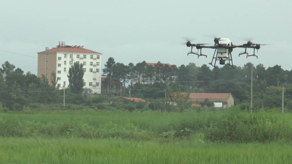 在陡山乡种粮大户刘雷的田埂上方,一架四翼无人机正在来回作业,随着无人机的飞行轨道,一道道药物从天而降,均匀地洒在田里,不一会的功夫,几十亩水稻田就完成了打药,既省时又省力。