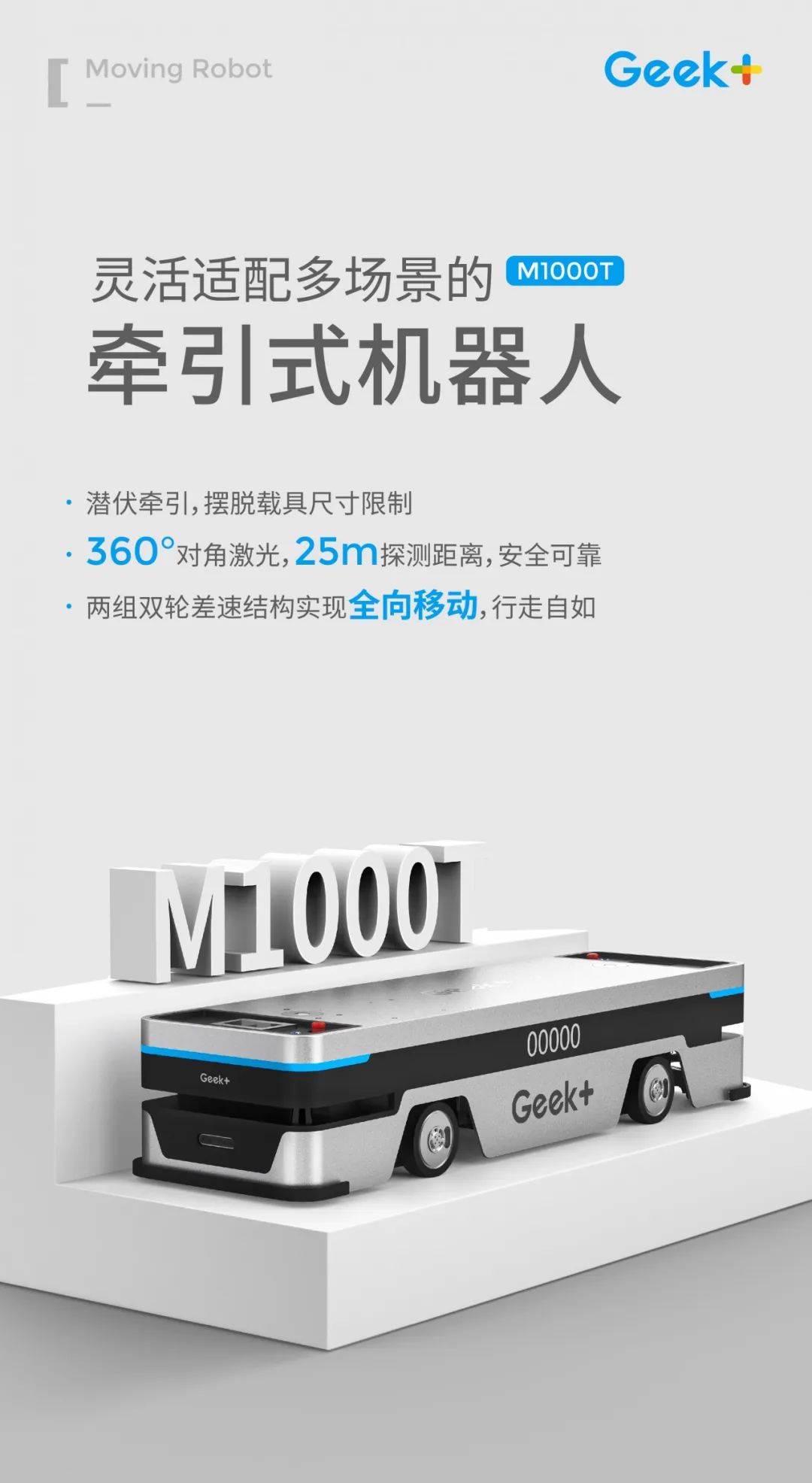 M1000T为搬运AMR家族中一款潜伏式牵引机器人,可以根据载具的大小定制尺寸,解决大型载具搬运难题。采用先进的激光SLAM导航代替传统磁条导航,前期施工量小,后期维护方便,且兼具美观性。