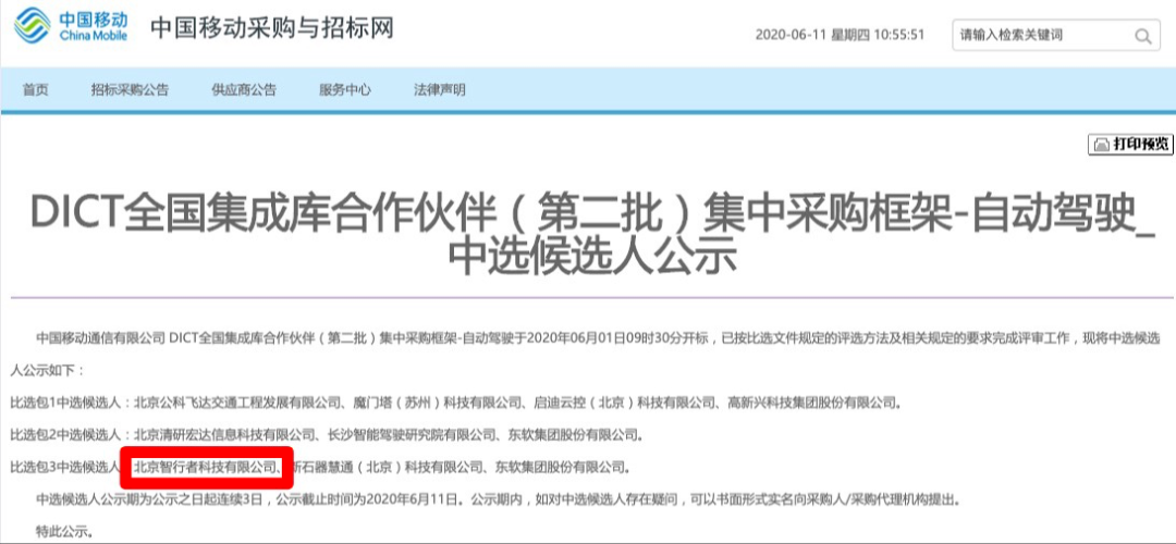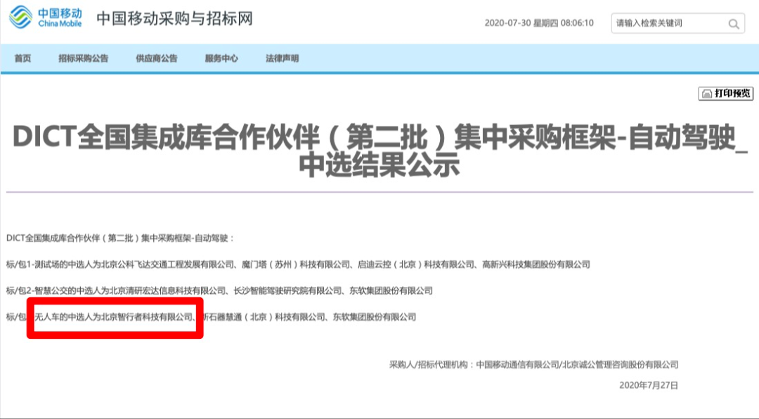 2020年7月27日,中国移动采购与招标网正式公布北京智行者科技有限公司中标了!
