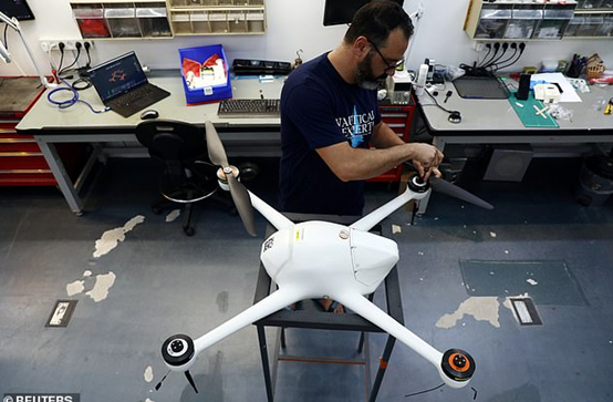 一名Airobotics员工在其以色列办事处的其中一架无人机上工作。无人驾驶飞机目前正被新加坡警察用来执行社会隔离措施