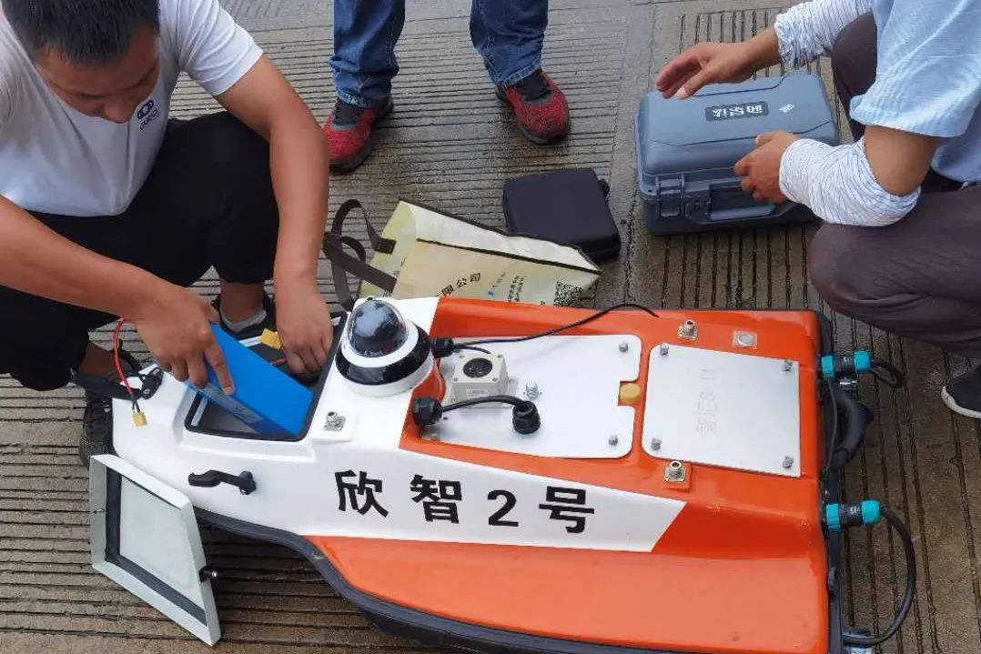 据现场一名项目负责人介绍,这是欣智2号无人船,长约1.2米、宽0.7米,该无人船利用水下综合探测系统对河底的淤泥断面进行动态检测,获取精确数据和影像进行分析,便于开展清淤工作。