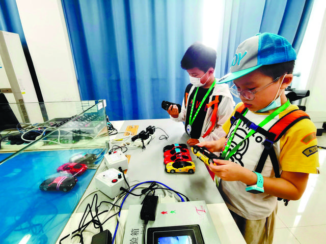 在交通与土木工程学院大厅内,小记者们在学院老师陈海龙的介绍下了解无人机。无人机之所以能飞,是因为螺旋桨转动,将空气分成了向上和向下两个部分。当向上的空气力量超过机身重量时,无人机就能升空。而要想无人机能清楚人的指令,信号是极为关键的。在山洞、隧道通常无法进行无人机飞行,所以当操作中检测到信号不稳定时,就应该控制无人机返航,否则,无人机接收不到指令,会坠机丢失。接着大家跟随老师来到实验室,“这是方向盘、变速杆、刹车、离合器,这些都爸爸妈妈们平常开车必须用到的哦!然后这前面的是发动机,它为汽车提供动力。谁知道它相当于人体的什么部位吗?”“我知道我知道,是心脏!”陈海龙的话音刚落,来自朝晖小学的小记者龚尹祺便迫不及待地答道。实验室里放着两辆简易车模,陈海龙详细讲解了每个部位及其作用,大家依次排队坐上车,踩刹车、踩离合、换挡,感受驾驶的乐趣,过了一把小小驾驶员的瘾。