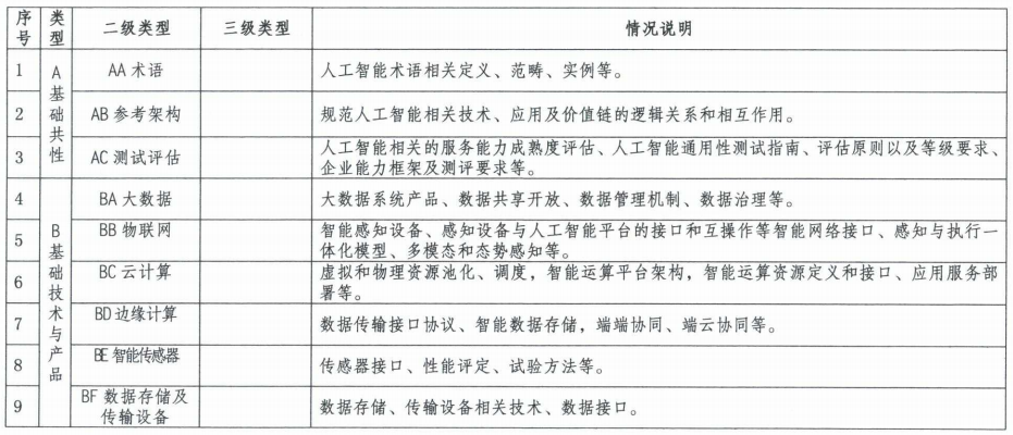 1.术语标准。用于统一人工智能相关概念、技术、应用行业场景,为其他各部分标准的制定和企业人工智能研究提供支撑,包括人工智能术语相关定义、范畴、实例等标准。