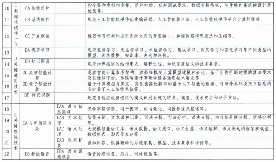 1.智能芯片标准。规范智能计算芯片、新型感知芯片及相关底层接口等,为人工智能模型的训练和推理提供算力支持。包括指令集和虚拟指令集、芯片性能、功耗测试要求、数据交换格式、芯片操作系统的设计及检测等标准。