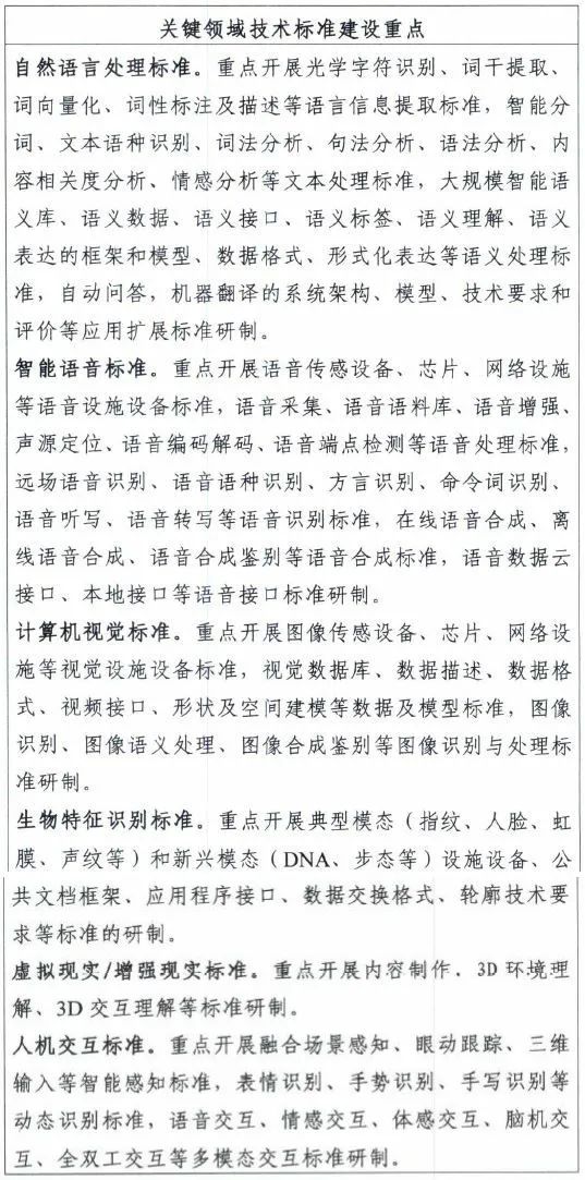 关键领域技术标准主要包括自然语言处理、智能语音、计算机视觉、生物特征识别、虚拟现实/增强现实、人机交互等部分,如图7所示。
