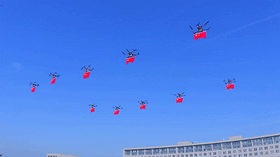 庆祝中华人民共和国成立70周年时,赤峰市政府广场上的无人机表演