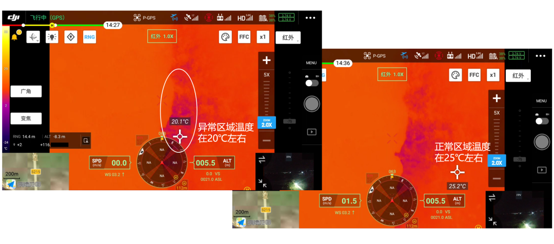 7 月 18 日晚上,在相关单位的组织和领导下,应急通讯保障分队对江西某 1800 米左右的圩堤进行无人机巡查。在飞行高度距离堤体 10 米左右时,通过禅思 H20T 的热成像回传画面,发现有一处区域存在明显成像区别,开启测温之后可以发现该区域与普通水面有 5℃ 左右温差,疑似渗水区域。