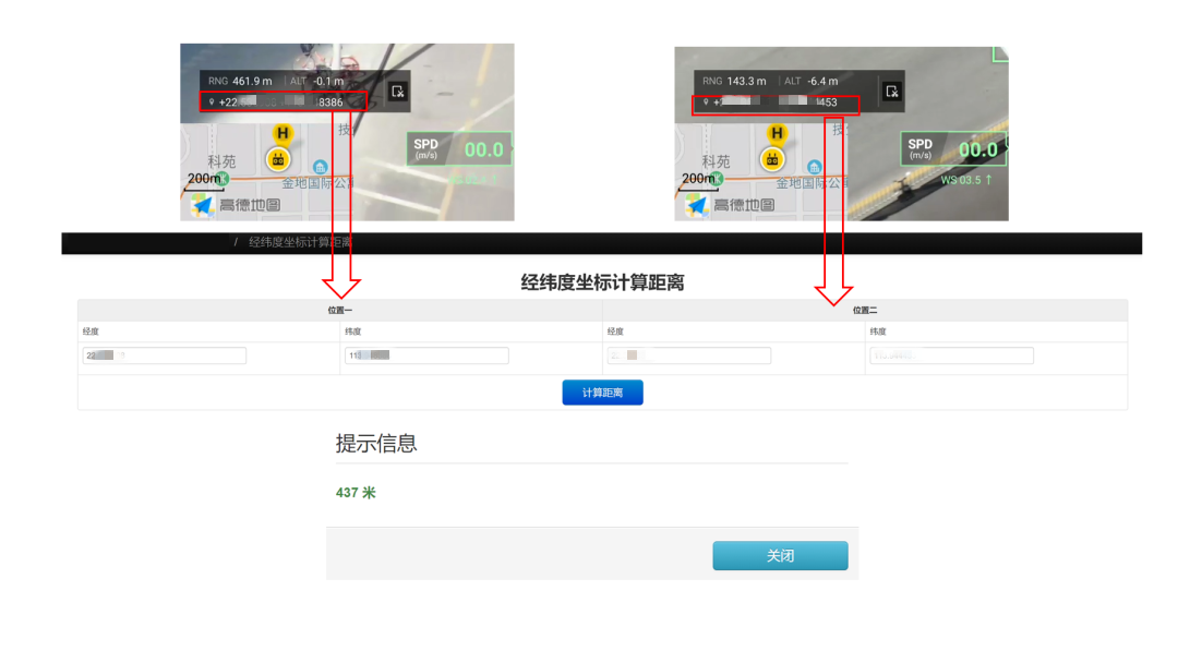 现场工作人员很快想到,可以用经纬 M300 RTK搭载禅思 H20T,通过激光打点定位测量距离。将无人机悬停在 80 米左右的高空,工作人员将激光中心点对准溃口两端的边缘,测量出两组经纬度坐标,在现场快速计算出了厘米级精度的溃口长度数据,为救援研判提供了信息支撑。