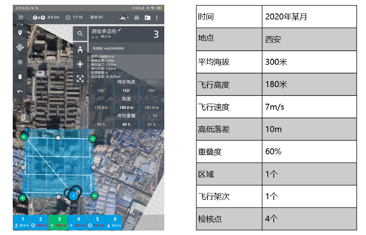 为了提高区域边界的数据效果,使用mdLiDAR3000 LR飞行时,飞行区域往外扩大了100m,实际飞行区域约为400m * 400m。飞行高度180m,重叠率60%;