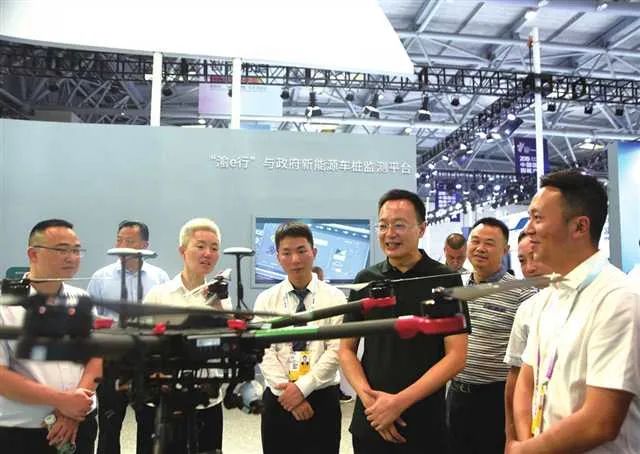 何涛(右一)在智博会上向来宾解说无人机的运用