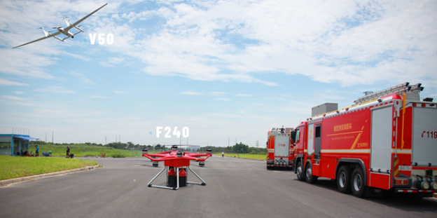 8月6日, 在位于上海金山的华东无人机基地,前不久成功完成大小金山岛无人机海上智能物流验证试飞的上海峰飞航空科技有限公司(以下简称“峰飞航空科技”),联合金山区消防局进行了一场“特殊”的消防演练:从侦察火情到实施灭火,均由无人机自主完成——负责侦察预警的超长航时垂直起降飞行器-大白鲨V50和负责灭火的超大载荷消防应急飞行器-风火轮F240“联合作战”,以一体化解决方案打造空中智慧消防。