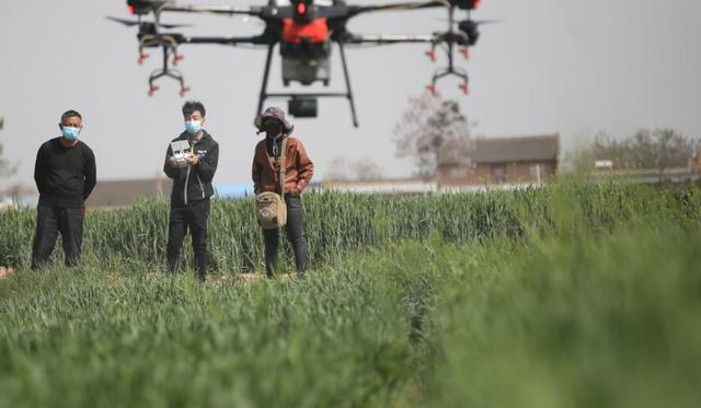 村民谭春胜,家里种了5亩小麦,他告诉记者:“因为最近是病虫害爆发期,所以要及时防控,这样才能减少病虫害大面积的发生。”今年已经是他第二年选择用无人机喷洒作业,谭春胜说,无人机作业喷洒均匀,用药节省,效率很高,过去用传统打药方式自己得用一上午,现在三五分钟就搞定了。