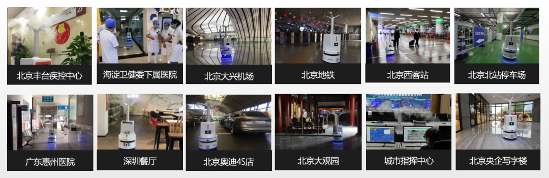 目前布科思喷雾消毒机器人已经实际应用到国内外各大机场、地铁、火车站、停车场、医院、诊所、 景区、汽车4S店、写字楼、园区、餐厅、政务大厅、企业展厅等地。