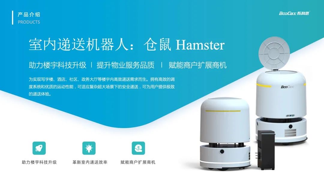 为实现写字楼、酒店、社区、政务大厅、机场、学校、娱乐场所等楼宇内高效递送需求而生。拥有高效的调度系统和优质的运动性能,能适应复杂超大场景下的安全递送,为用户提供极致的递送体验。